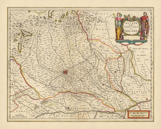 This extraordinary piece of history captures the essence of several key cities, including Como, Bergamo, Pavia, Piacenza, and the green expanse of Parco Agricolo Sud Milano. Each city is depicted with remarkable precision, revealing the unique characteristics that made them integral parts of the Duchy. The map's hand-colored outlines further enhance the intricate details, providing a vibrant snapshot of the era.