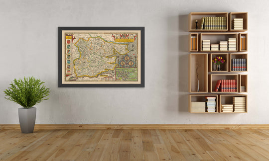 Many of the towns, villages and cities in Essex are already visible in this ancient map, such as Colchester, Chelmsford and Braintree. There's a detailed engraving of Colchester in the bottom right (the capital of the county) and some coats of arms on the left side of the map.