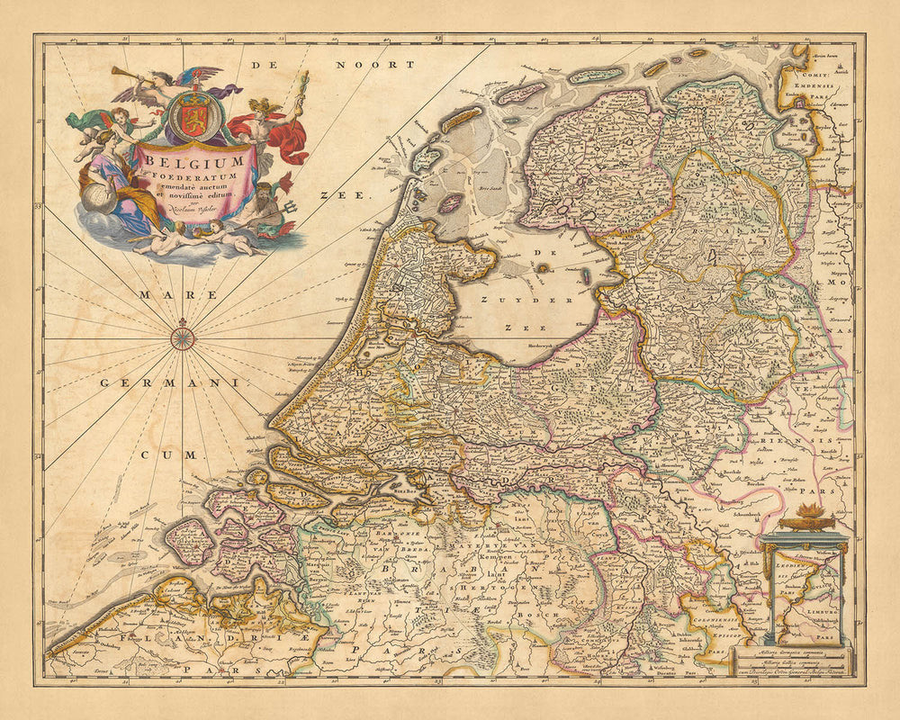 Old Map of Federated Belgium by Visscher, 1690: Amsterdam, Rotterdam, Antwerp, Düsseldorf, Ghent