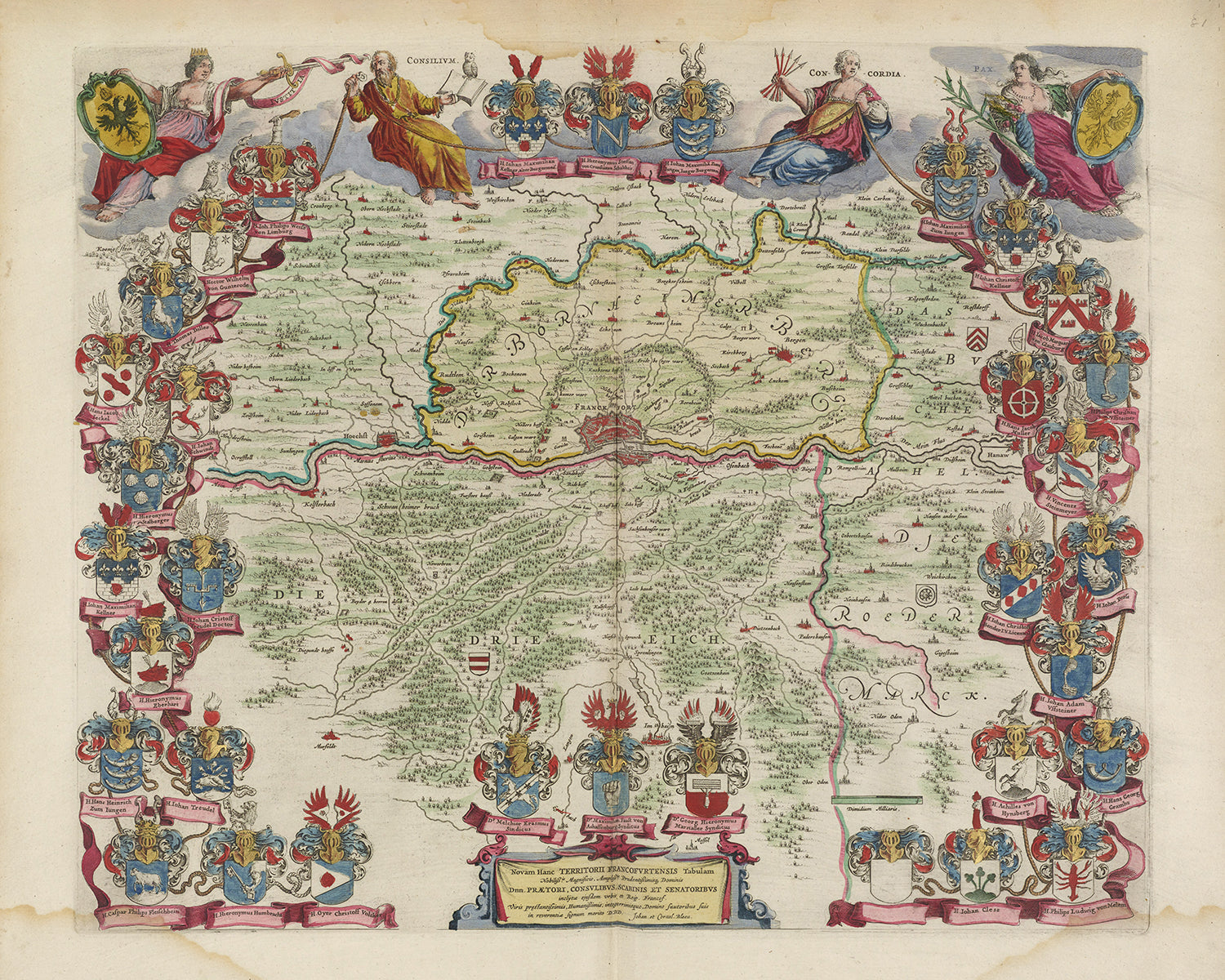 Step back in time and immerse yourself in the rich history of Frankfurt and its surroundings with this captivating map crafted by Joan Blaeu in 1665. Rendered in exquisite detail and impressive craftsmanship, this antique treasure illustrates the geographical and socio-political landscape of the region during the 17th century. With Greater Frankfurt at its center, this map encapsulates a radius of 12km, encapsulating numerous notable settlements. A delightful highlight of this piece is the carefully illustrated coats of arms of Frankfurt's most influential families, providing an intimate glimpse into the city's powerful lineages.