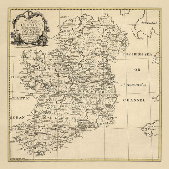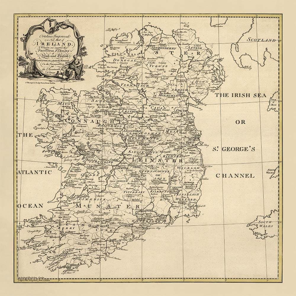 Old Map of Ireland Family Names, 1795: O'Neill, O'Brien, O'Leary, O'Sullivan, O'Conor, O'Flaherty, O'Dowd, etc