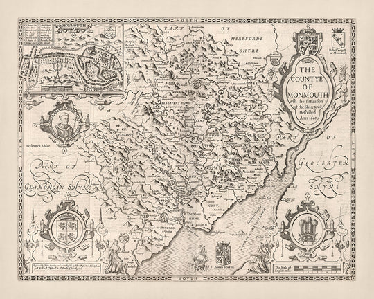 "The Countye of Monmouth," crafted by the esteemed English cartographer John Speed in 1610, is a captivating window into the past, showcasing the intricate political and physical landscape of Monmouthshire during the early 17th century. This map, part of Speed's renowned atlases "The Theatre of the Empire of Great Britaine" and "A Prospect of the Most Famous Parts of the World," is a testament to his meticulous attention to detail and his profound understanding of geography. The map not only delineates the boundaries and topographical features of Monmouthshire but also provides a glimpse into the administrative divisions and the rich historical tapestry of the region.