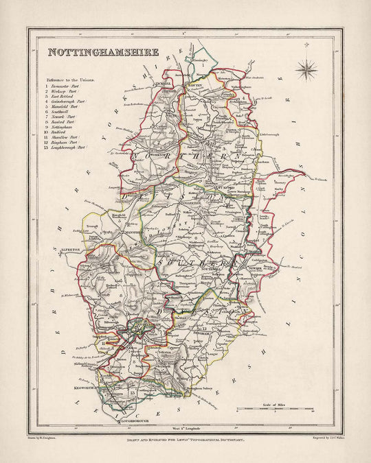 Owning the Old Map of Nottinghamshire by Samuel Lewis, 1844, allows you to delve into the past, explore the region's rich history, and appreciate the intricate details of this beautifully crafted map. It is a treasure for history enthusiasts, cartography aficionados, and anyone seeking a unique piece of Nottinghamshire's heritage.