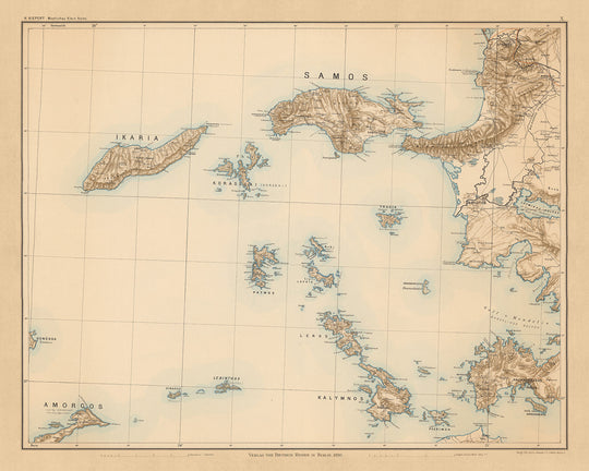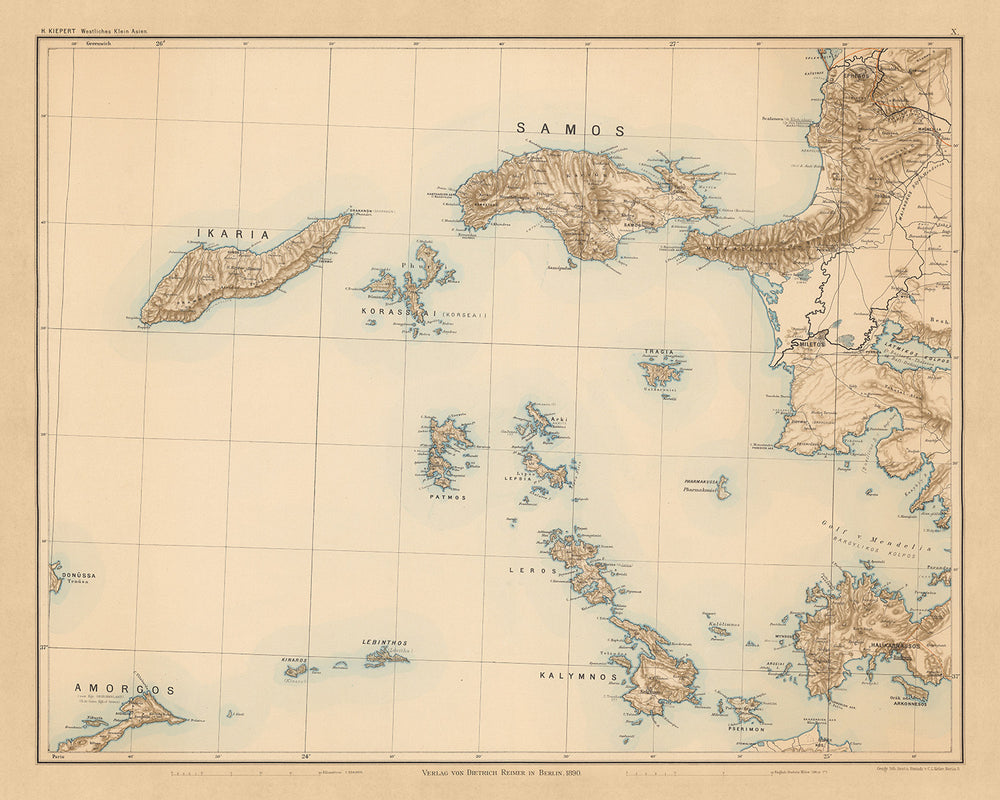 Old Map of Samos & Aegean Islands by Kiepert, 1890: Ikaria, Kalymnos, Fournoi, Ephesus