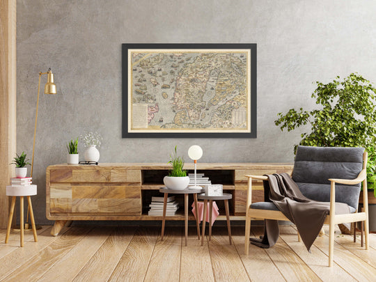 This is an exceedingly rare, full colour map of Scandinavia (Denmark, Sweden, Norway, Finland) from 1539. Created by Swedish cartographer and writer Olaus Magnus, it is the first ever map of the Nordic countries with accurate place names and labels.