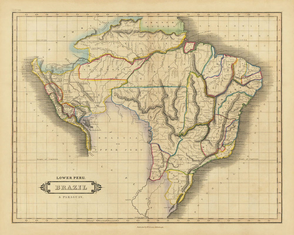 The "Lower Peru, Brazil & Paraguay" map, crafted by the esteemed David Lizars in 1838, is a masterful depiction of the central part of South America. This historical map, rich in detail and vibrant in color, showcases the political and physical landscapes of the time. Lizars, known for his meticulous cartographic work, has expertly color-coded the countries and states, providing a clear and informative view of the region's geopolitical boundaries. This map is not just a navigational tool but a window into the past, reflecting the knowledge and artistry of early 19th-century cartography.