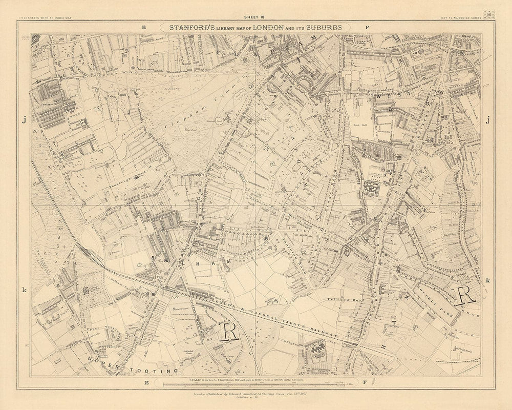 The map was originally published in 24 sheets. Altogether the map would've measured about 2 metres wide (78 inches). This here is sheet 18, which focuses on Clapham, Clapham Common and Balham in the London boroughs of Lambeth and Wandsworth.