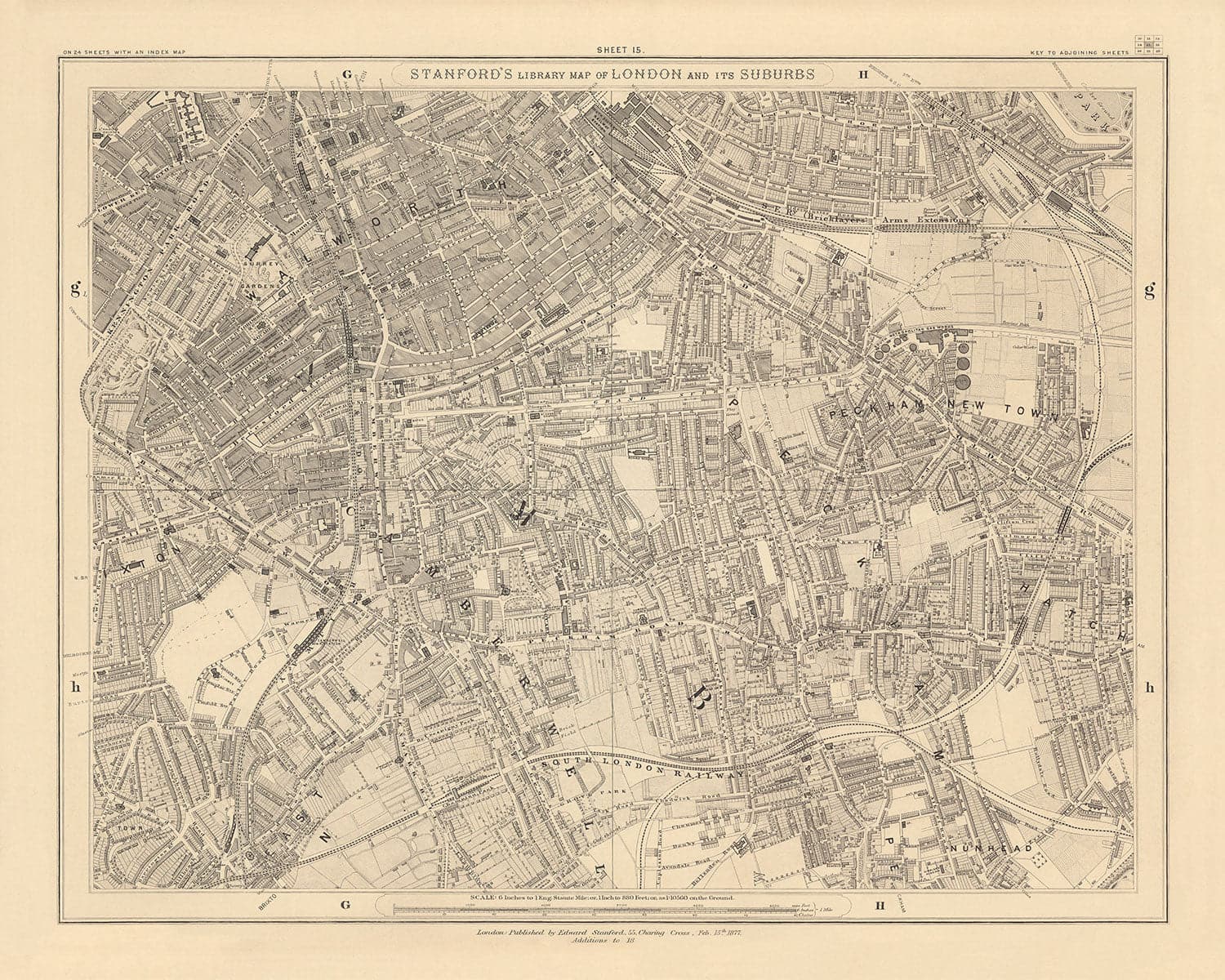 The map was originally published in 24 sheets. Altogether the map would've measured about 2 metres wide (78 inches). This here is sheet 15, which focuses on the south London borough of Southwark and the areas of Camberwell, Peckham, Nunhead, Walworth and Old Kent Road.