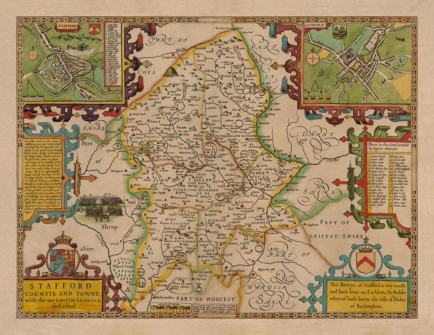 Many of the towns, villages and cities in Staffordshire are already visible in this map. Back in the 1600s, Staffordshire covered much of what is now the West Midlands. Wolverhampton, Birmingham, and Walsall are all on this map.