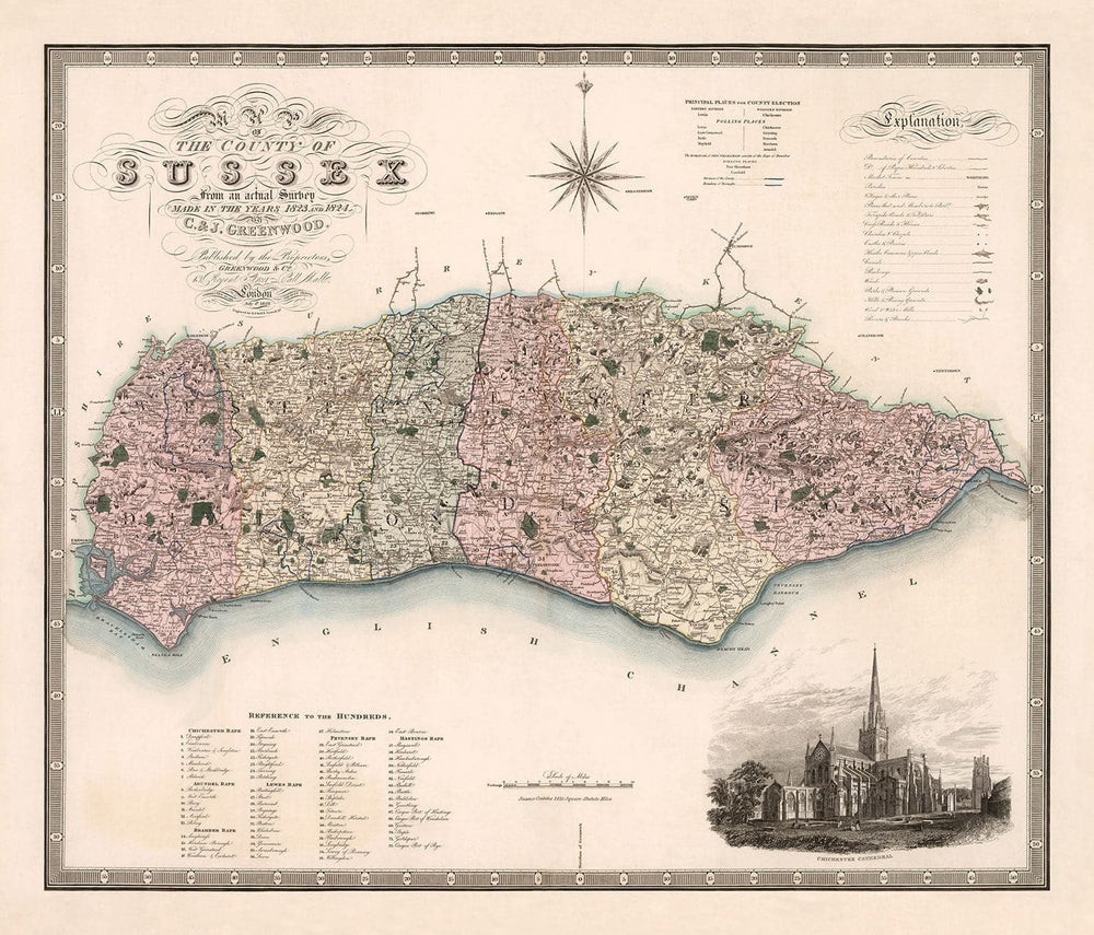 This old, full colour and wonderful map shows the county of Sussex as it was in 1829, before it was split up into West, East and Mid Sussex. Published in Greenwood's Atlas of England & Wales and engraved by J & C Walker, this is one of the finest old county maps from the 1800s.