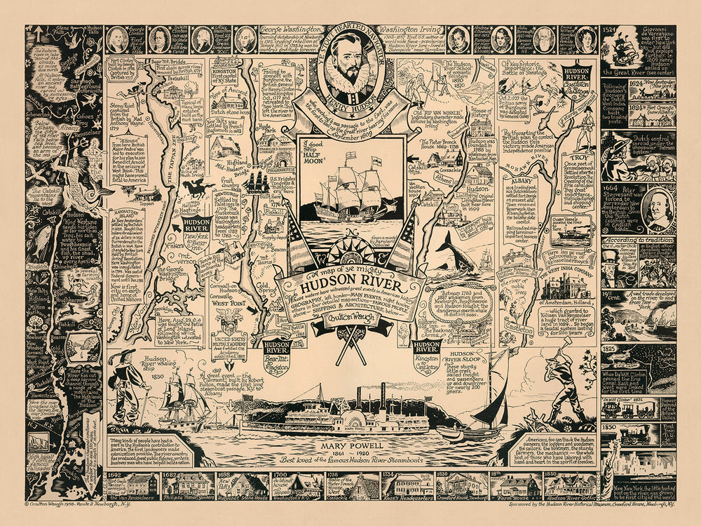 - The Mary Powell, a famous Hudson River Steamboat is shown in the bottom of the main section of the map.