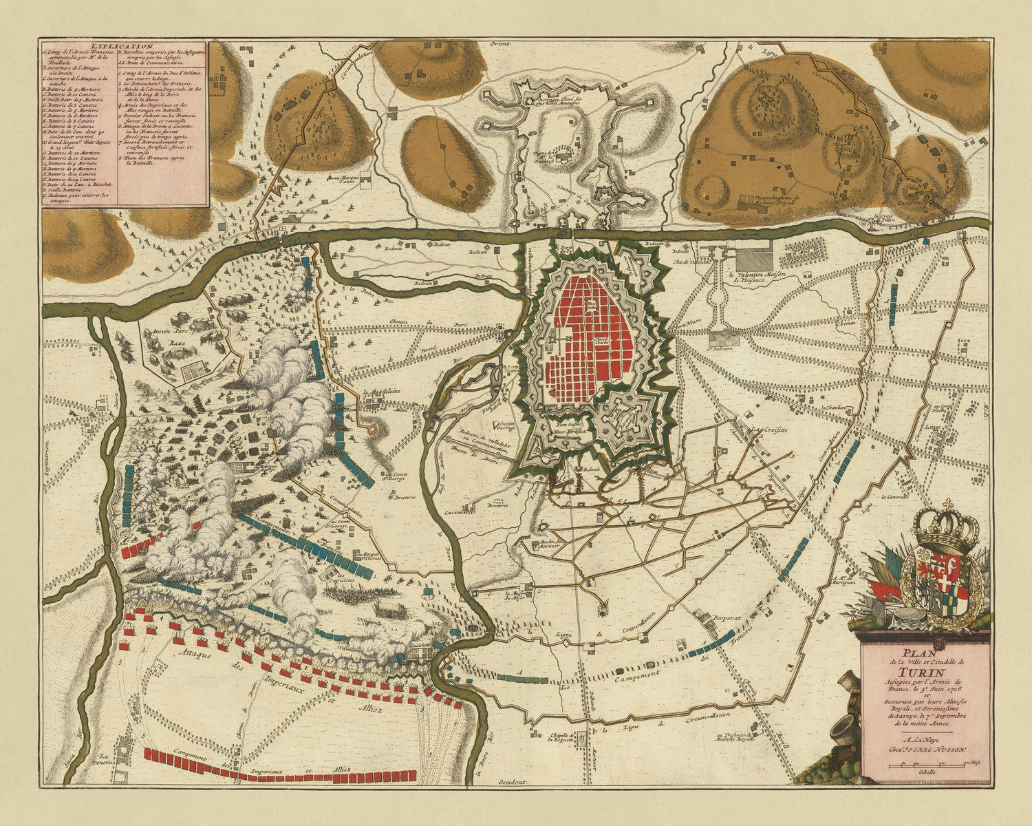 Pierre Husson’s 1706 Torino / Turin Battle Plan is a masterclass in Baroque-era military cartography, composed at the very moment the Siege of Turin reshaped the War of the Spanish Succession. Husson’s hand captures more than thirty named sites and descriptive notes, illuminating how geography, fortification, and maneuver intertwined over four arduous months. Red and blue notations distinguish French besiegers from the city’s defenders, while an ornate cartouche crowned with armorial bearings announces the map’s weight and ceremony. Beyond its beauty, the work records a turning point: the French investment under Louis de la Feuillade is methodically plotted, and the decisive counterstroke of Prince Eugene of Savoy is foreshadowed in the terrain and avenues of approach.