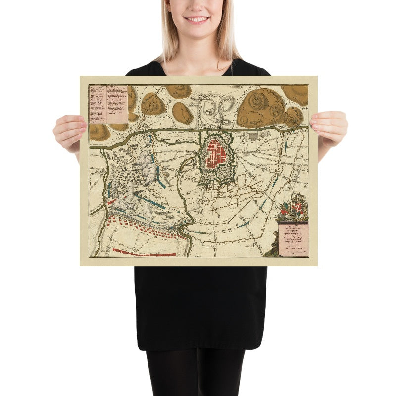 • Design/style context: Detailed artistic representation typical of 17th–18th-century cartography; uses color to indicate troop positions and terrain; features an ornate cartouche with heraldic symbols.
