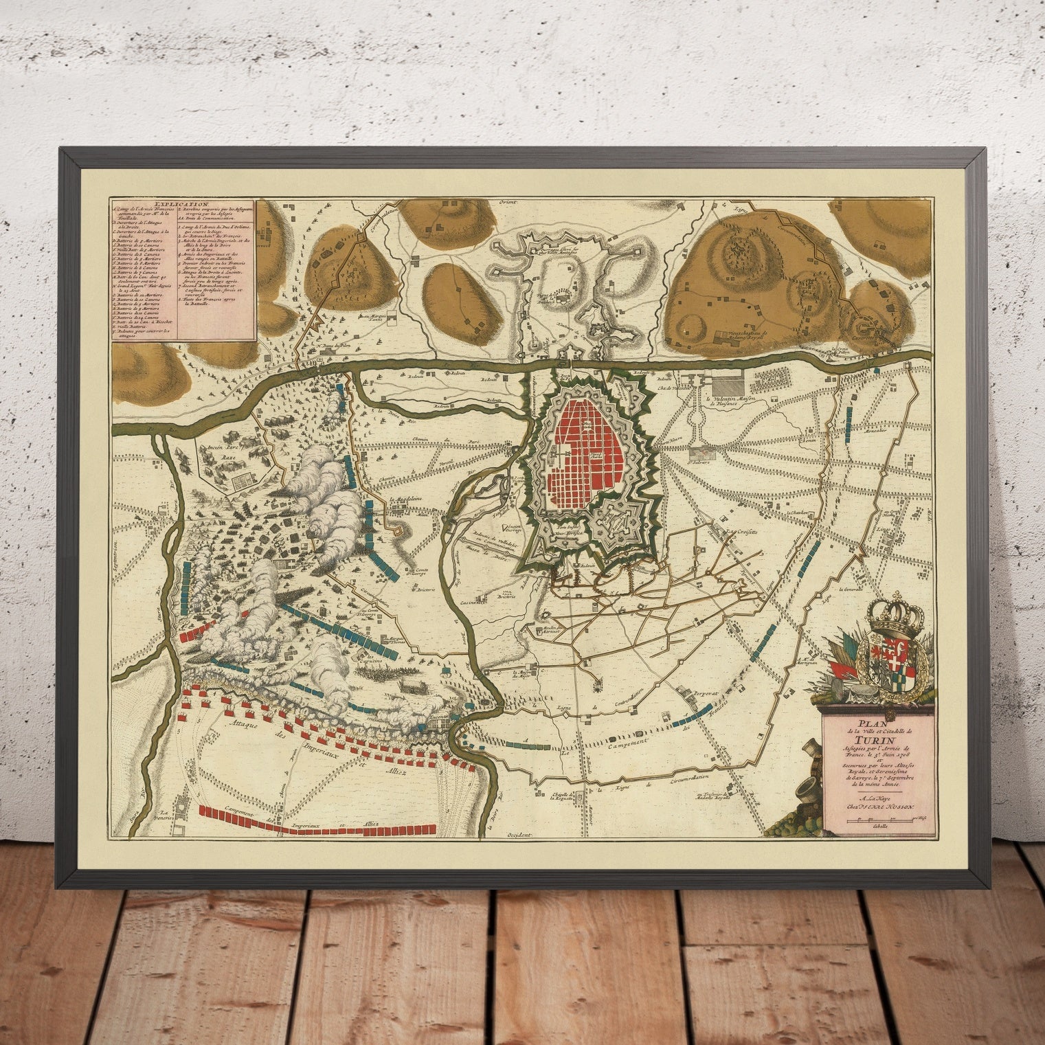 Husson, renowned for marrying aesthetic refinement to operational precision, achieves a rare equilibrium here. His “Campagnes du Synthèse” labeling ties the immediate siege lines to the larger campaign, while the explanatory key decodes symbols with a clarity that rewards close study. The heraldic cartouche, lavish yet balanced, frames a battlefield where color communicates command, and ornament never obscures intelligence. Collectors and historians will find in this plan both an object of beauty and a primary source: a contemporary witness to the 1706 siege whose outcome shifted alliances, secured Savoyard ascendancy, and helped redraw the map of Northern Italy for a generation.