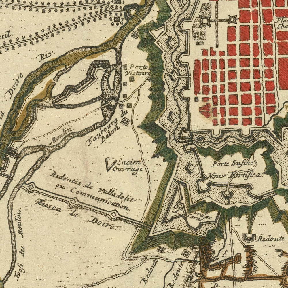 • Fortifications: The city’s defensive walls and bastions are clearly marked.