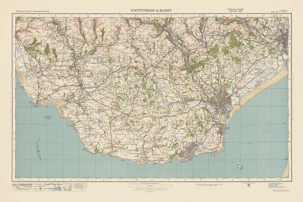 This old Ordnance Survey map, Sheet 109 - Pontypridd & Barry, is a fascinating piece of cartographic history from the One-inch "Popular" edition, England and Wales, published in 1925. The map showcases the towns of Pontypridd and Barry, along with several other significant settlements and interesting features in the surrounding area.