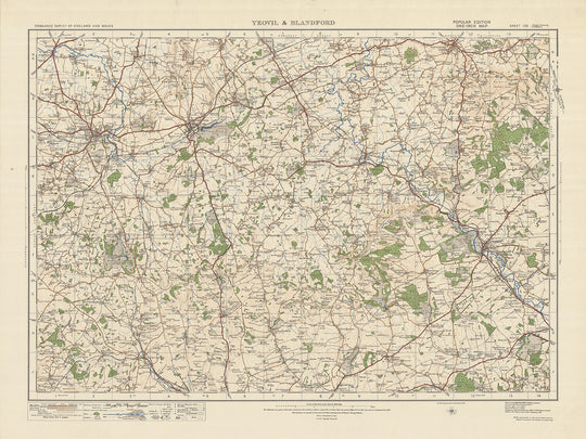 This meticulously crafted reproduction of the Ordnance Survey's One-inch "Popular" edition map, Sheet 130 - Yeovil & Blandford, from 1925 offers a fascinating glimpse into the past. The map showcases the historic county of Dorset in England and Wales, featuring prominent towns such as Sherborne, Shaftesbury, Ilchester, Maiden Newton, and the picturesque Dorset Area of Outstanding Natural Beauty (AONB).