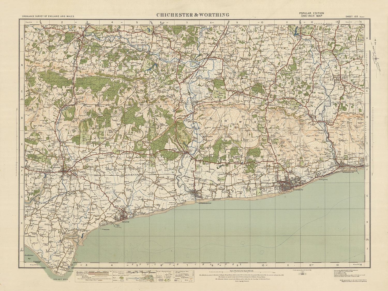 This vintage map, titled "Sheet 133 - Chichester & Worthing," is part of the Ordnance Survey's One-inch "Popular" edition of England and Wales, published in 1925. It provides a fascinating glimpse into the past, showcasing the towns, cities, and interesting features of the Chichester and Worthing region. The map covers an area rich in history, located in the historic county of Sussex.