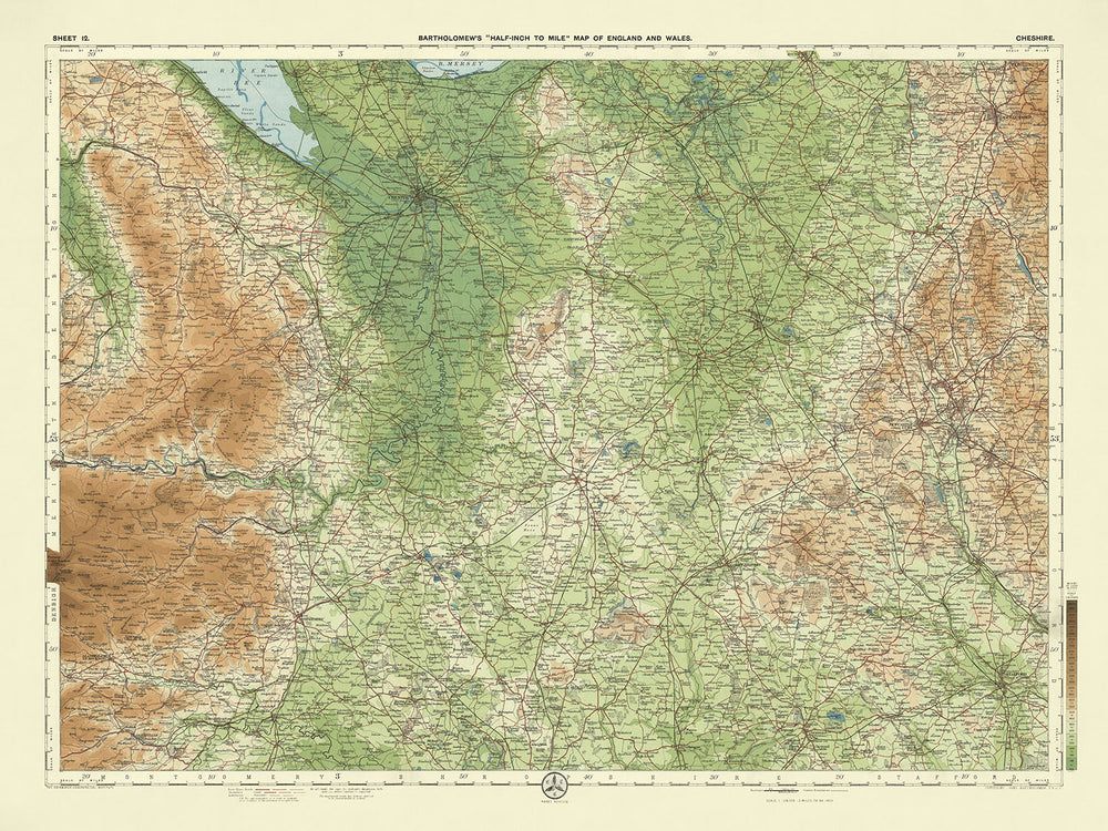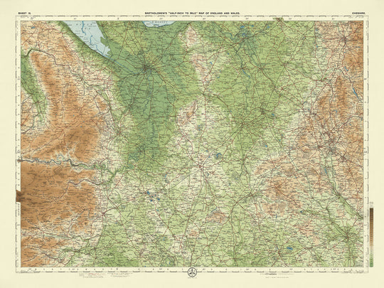 The map's design is both clear and captivating, utilizing a half-inch to the mile scale (1:126,720) that was particularly popular among cyclists and tourists of the era. The innovative use of color gradation to represent landscape relief is a hallmark of Bartholomew's maps, offering a vivid depiction of the region's topography. From the lush greens of the lowlands to the earthy tones of the higher elevations, this map beautifully captures the varied landscape of Cheshire and its surroundings.