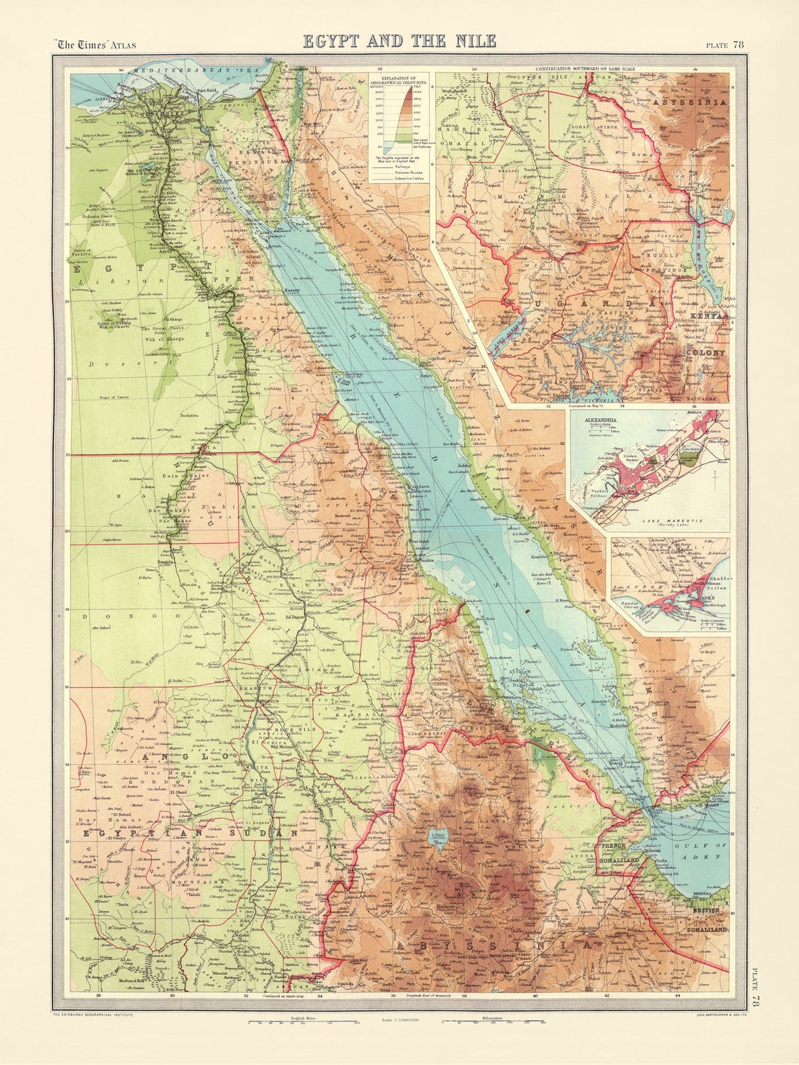 The political framework is drawn with lucid economy. Clearly labeled boundaries delineate Egypt’s borders and internal divisions, while the long southern frontier with Anglo‑Egyptian Sudan is traced with the cartographic assurance that characterized the period. The Sinai land bridge is set apart by both color and relief, emphasizing its role as hinge between Africa and Asia. Insets focused on Alexandria and its environs amplify the story: breakwaters, harbor basins, railheads, and canalized waterways are articulated to reveal the city’s industrial and maritime reach across the Delta. Urban names constellate along the littoral and within the Delta’s lattice of channels, from the approaches to Port Said to the shoulders of Rosetta and Damietta, mapping a landscape where antiquity and modern infrastructure entwine.