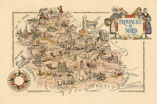 Historically, the "Provinces du Nord" map is significant as it captures the mid-20th-century essence of the Nord region, a time of cultural richness and historical reflection. The map serves as a visual document of the region's heritage, showcasing its connection to neighboring areas and its role in historical events. The artistic elements, such as the ornate title cartouche and decorative border designs, reflect the map's historical context and the cartographic styles of the time. This map is not only a valuable historical artifact but also a beautiful piece of art that celebrates the Nord region's legacy.