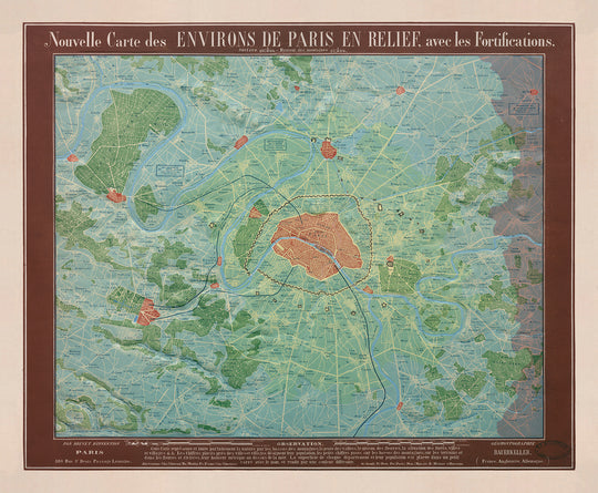 Immerse yourself in the rich history of the French capital with this captivating old relief map of Paris, meticulously crafted by the renowned cartographer, Georg Bauerkeller, in the mid-19th century. This vintage cartographic masterpiece not only showcases the city of Paris but also intricately details the surrounding regions, presenting a vivid snapshot of the area during a time of great change and innovation. With its intricate detailing and historical significance, this map is a must-have for history enthusiasts, cartography aficionados, and lovers of Paris alike.