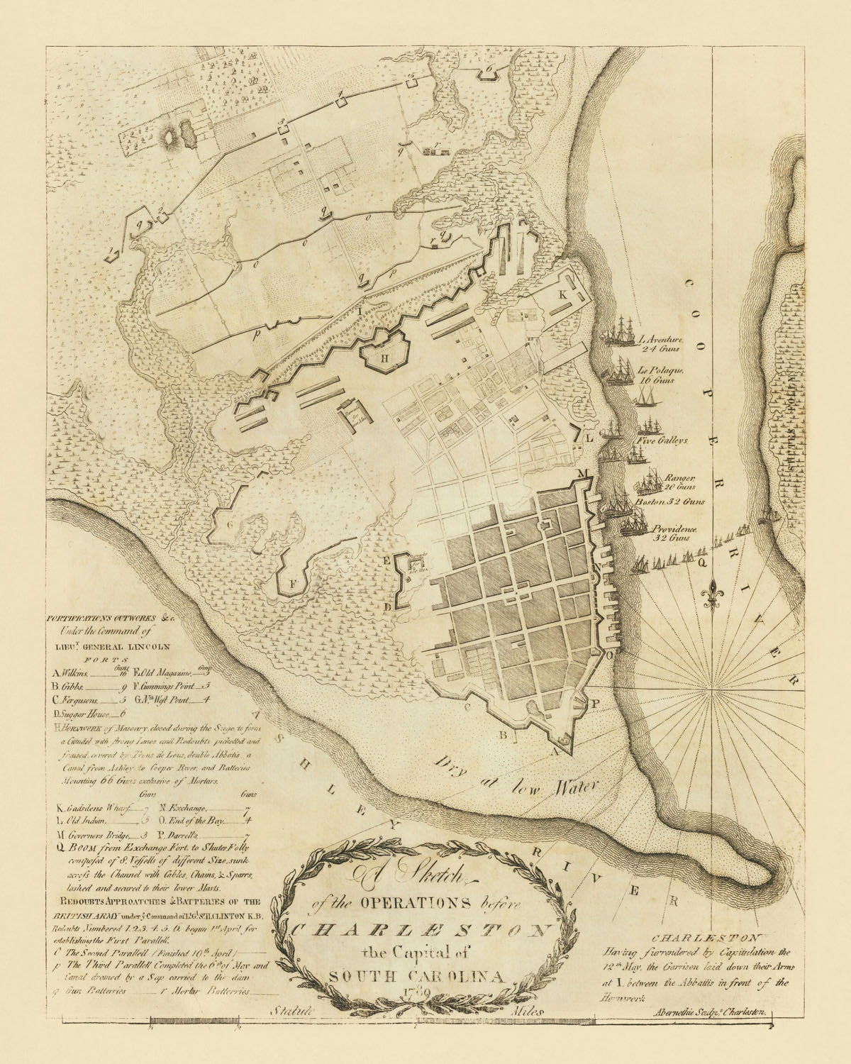 What makes this plan singular is its granular depiction of the siege mechanics. Abernethie charts British ship positions hemming in the harbor and the vital blockade of the Cooper River, effectively severing American lifelines. Fortifications are carefully labeled—from the Battery guarding the waterfront to the outer works that once promised a stubborn defense—while the placement of American encampments and British parallels reveals the tightening noose that culminated in General Benjamin Lincoln’s capitulation on May 12, 1780. Notations of vessels such as the Providence, Ranger, and La Fage situate naval assets within the broader choreography of attack and denial, reflecting how sea power and earthworks worked in concert to force the largest American surrender of the war.