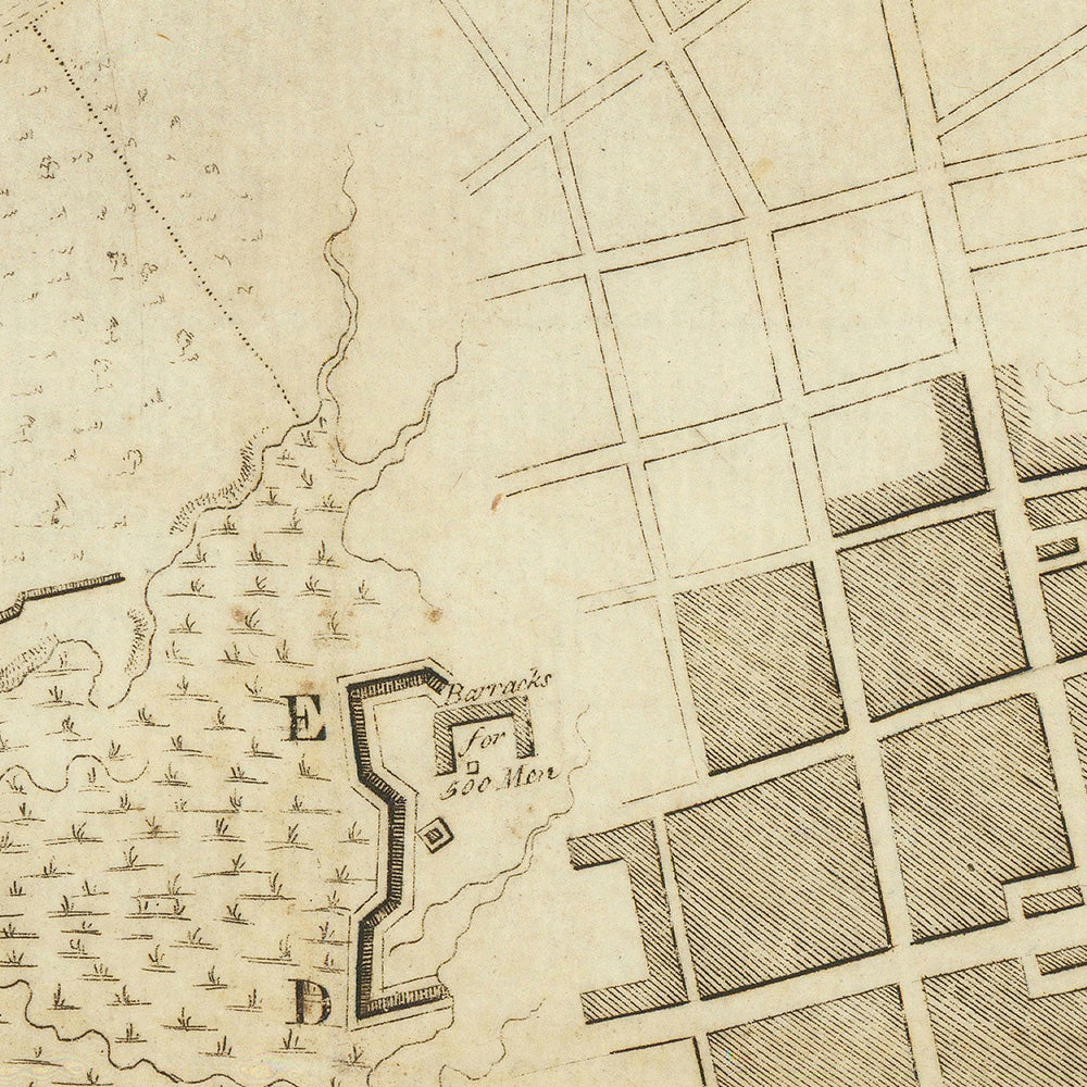 Abernethie’s engraving—deemed naïve by some—proves remarkably effective in conveying both the lived city and its war footing. Streets and blocks are crisply plotted, with King Street marching inland from the bustle of East Bay and the Market, the Commons laid out as a civic breathing space, and St. Philip’s Church rising as a landmark within the grid. Waterfront defenses and batteries knit the urban fabric to the harbor, while the West Side and early districts register Charleston’s growing footprint. This union of urban planning and martial preparation underscores why Charleston, a premier Atlantic entrepôt, drew such concentrated British attention in 1780.