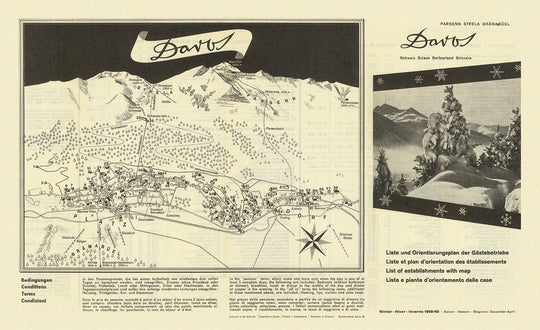 Step into the golden era of alpine adventure with this exceptional 1959 map of Davos, meticulously crafted by Buchdruckerel Davos AG for the 1959/1960 winter season. At a time when Davos was solidifying its reputation as one of the world’s premier ski resorts, this map served as both a navigational tool and a testament to the region’s burgeoning tourism industry. It elegantly details the towns of Davos and Parsenn, set against the dramatic backdrop of the Swiss Alps, and provides a fascinating snapshot of mid-20th-century winter sports culture in Switzerland.