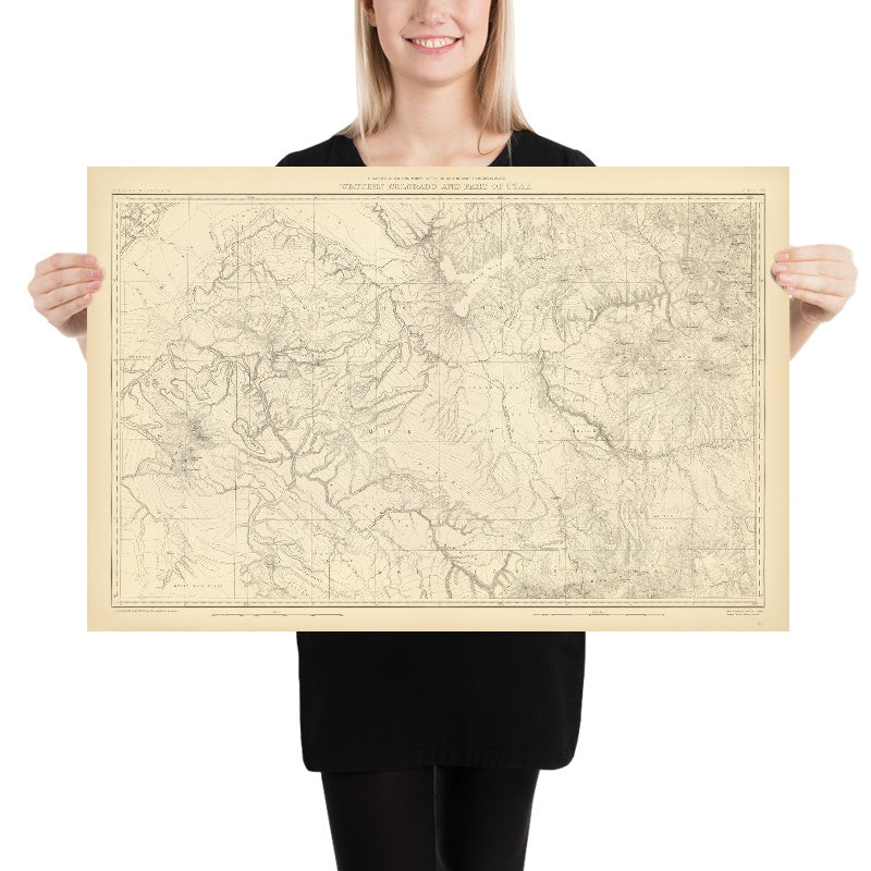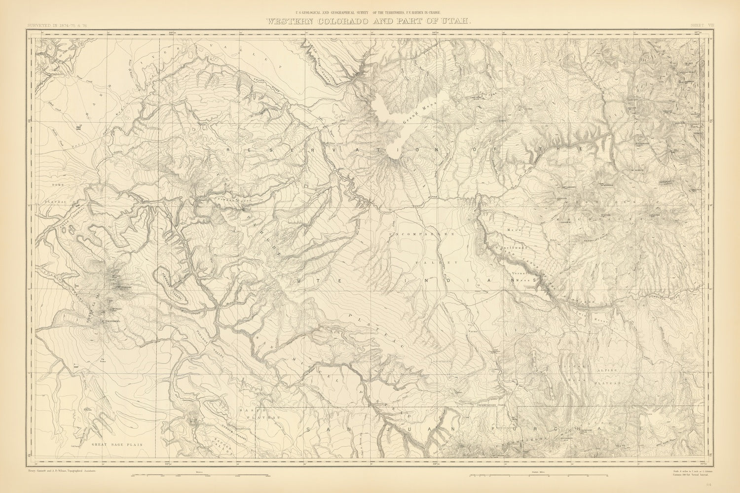 Western Colorado And Part of Utah [Sheet VIII] (1877) presents one of the most exacting field portraits of the southern Rockies from the celebrated Hayden Survey. Meticulously engraved, it translates geology into legible relief: contour lines ripple across the San Juan Mountains, the Elk Range near Snowmass and Aspen, the Book Cliffs that march into eastern Utah, and the deeply incised canyons draining to the Green River. Streams, creeks, and major rivers are plotted with scientific care, revealing drainage divides and hidden basins, while plateaus and mesas step down toward the desert. Hayden’s cartographic language merges geology and geography, rendering the country’s structure as clearly as its surface shape. Settlement is purposefully sparse, amplifying the sense of distance and altitude that defined the region in the mid-1870s. The result is a quietly dramatic portrait of a frontier landscape on the cusp of discovery.