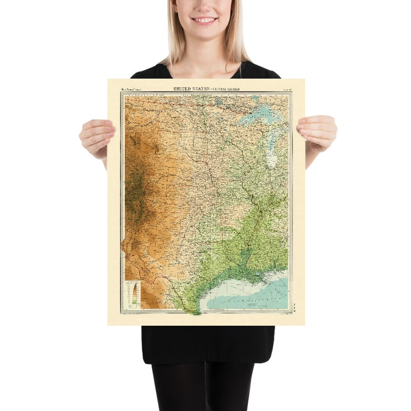 United States - central section is John George Bartholomew’s 1922 vision of the American heartland, issued by the Edinburgh Geographical Institute as the second iteration of the landmark 1920 edition. It marks a decisive stylistic and technical shift from the earlier, Andree-influenced 1895 tradition, embracing Bartholomew’s own cartographic language of color, clarity, and analytical precision. Hypsometric tints model the land’s rise from the Gulf littoral to interior uplands, while bathymetric shadings contour the coastal shallows where trade awakened the region to the world. Shipping routes with measured distances lace the Gulf of Mexico, underscoring the map’s practical orientation toward navigation and commerce. The design is quintessentially early twentieth century—restrained, rigorous, and quietly authoritative.