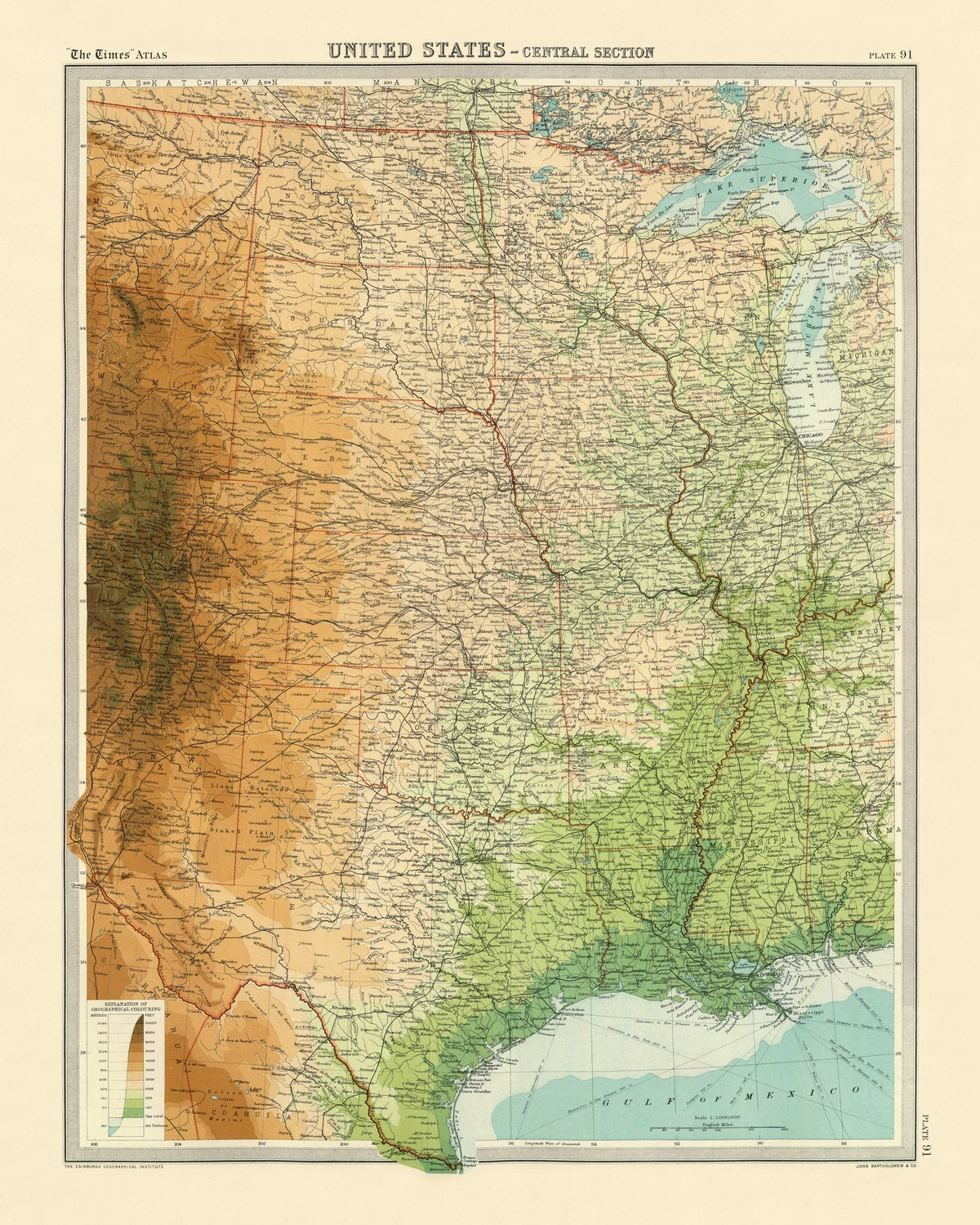 Bartholomew’s color gradients render the central United States as a living topography. The low, humid arc of the Gulf Coastal Plain deepens through greens into warmer ochres and browns over the Texas Hill Country, the Ouachita and Ozark highlands, and the Cumberland uplifts. Spot heights prick the relief with numerical certainty, while river systems—Mississippi, Arkansas, Red, Trinity, Brazos, and the Colorado of Texas—trace the arteries that fed cotton, timber, and oil economies. Along the coast, bathymetric tints hint at shelves and deeps, a subtle guide to approach and passage. The Mississippi Delta’s fans and bayous are set against a backdrop of measured elevation, revealing at a glance why floodplains, bluffs, and terraces shaped settlement, agriculture, and transport.